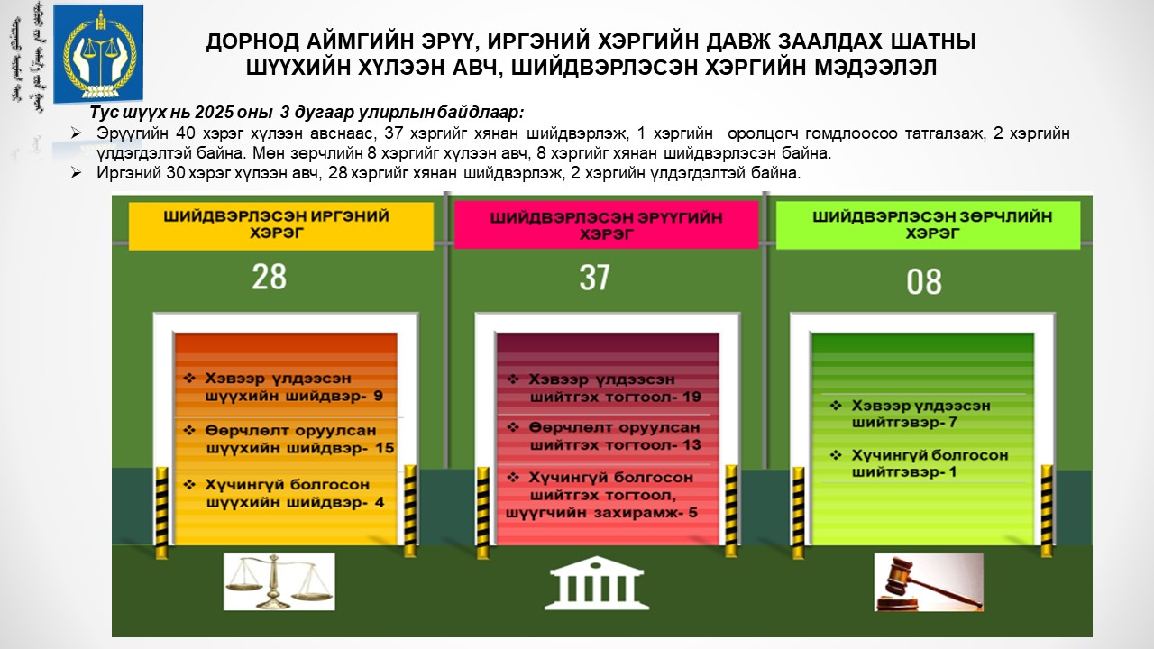 ДОРНОД АЙМГИЙН АНХАН БОЛОН ДАВЖ ЗААЛДАХ ШАТНЫ ШҮҮХИЙН 3 ДУГААР УЛИРЛЫН БАЙДЛААР ХҮЛЭЭН АВЧ, ШИЙДВЭРЛЭСЭН ХЭРГИЙН ТОВЧ МЭДЭЭЛЭЛ