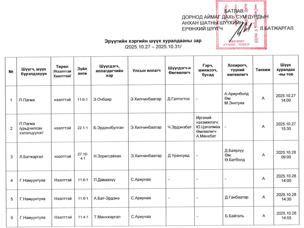 ДОРНОД АЙМГИЙН АНХАН БОЛОН ДАВЖ ЗААЛДАХ ШАТНЫ ШҮҮХИЙН 3 ДУГААР УЛИРЛЫН БАЙДЛААР ХҮЛЭЭН АВЧ, ШИЙДВЭРЛЭСЭН ХЭРГИЙН ТОВЧ МЭДЭЭЛЭЛ