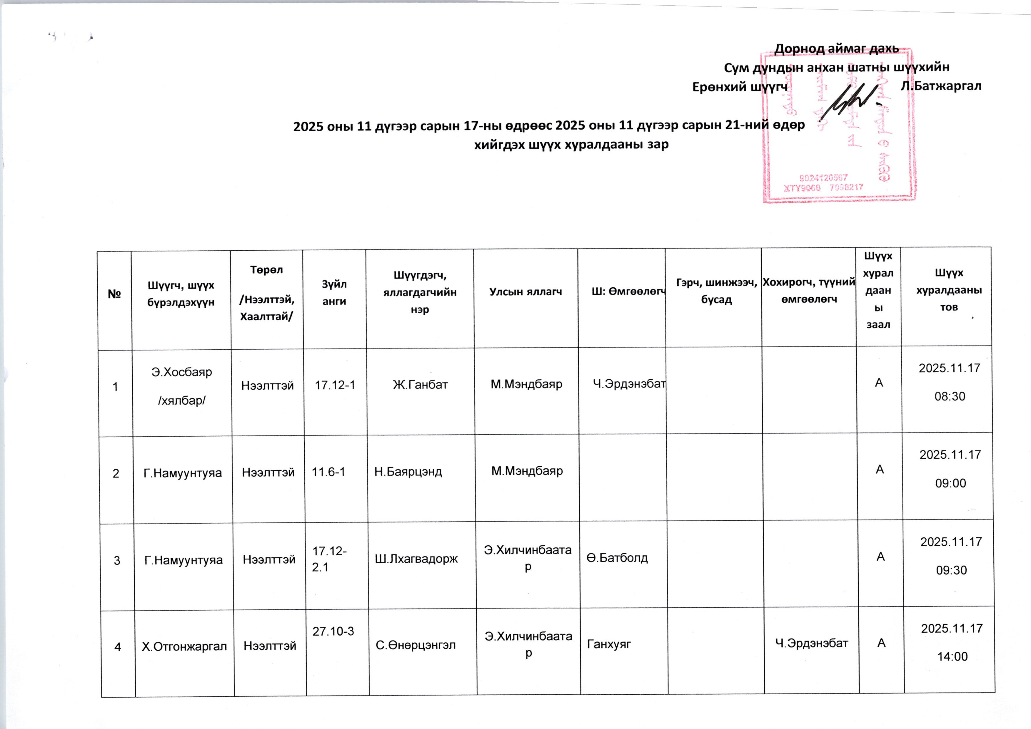 ДОРНОД АЙМАГ ДАХЬ СУМ ДУНДЫН АНХАН ШАТНЫ ШҮҮХИЙН 2025.11.17-НЫ ӨДРӨӨС 2025.11.21-НИЙ ӨДРИЙН ХУГАЦААНД ХИЙГДЭХ ЭРҮҮГИЙН ХЭРГИЙН ШҮҮХ ХУРАЛДААНЫ ЗАР
