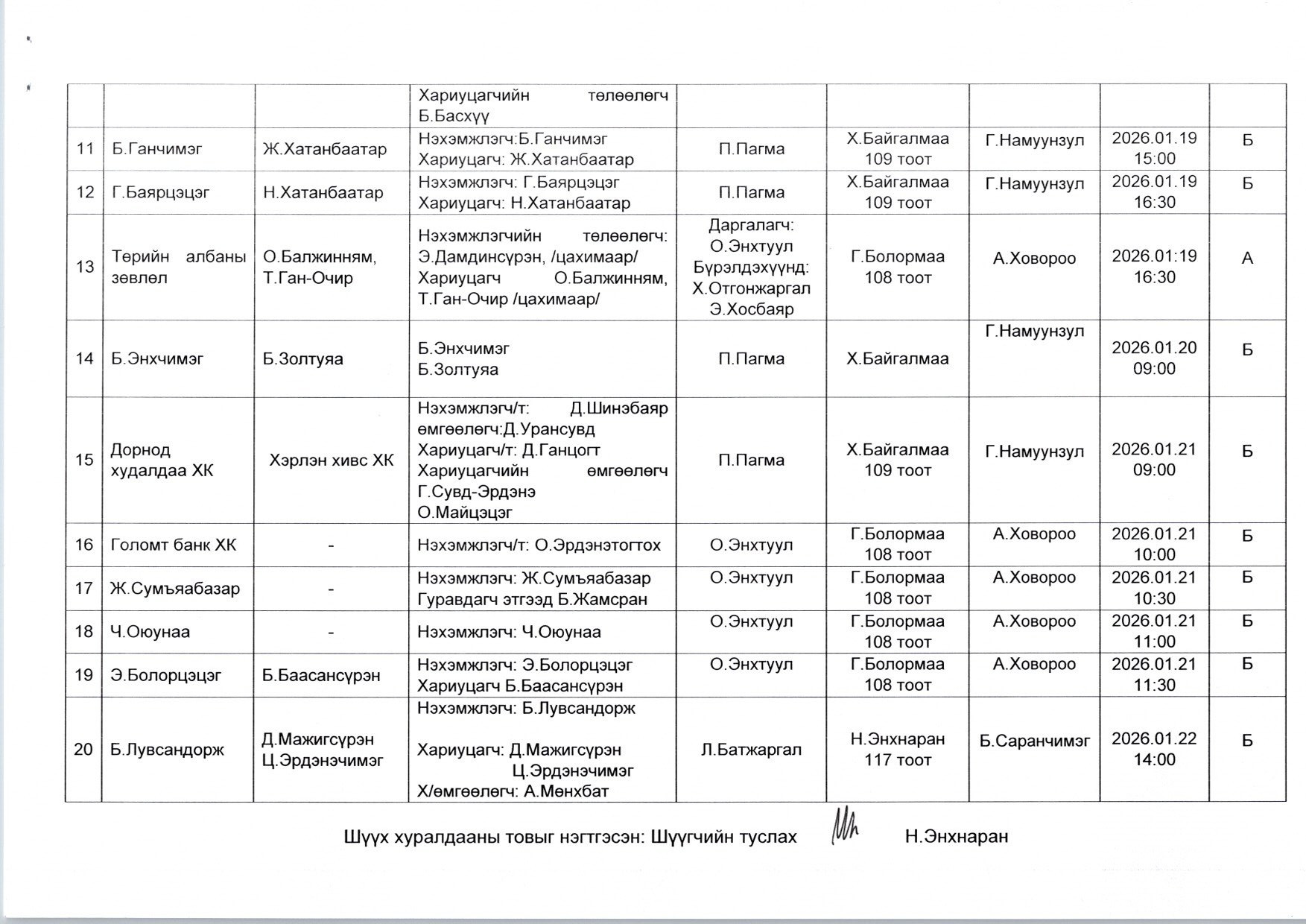 ДОРНОД АЙМАГ ДАХЬ ЗАХИРГААНЫ ХЭРГИЙН АНХАН ШАТНЫ ШҮҮХИЙН 2026.01.20-НЫ ӨДРӨӨС 2026.01.22-НЫ ӨДРИЙН ХУГАЦААНД ХИЙГДЭХ ШҮҮХ ХУРАЛДААНЫ ЗАР