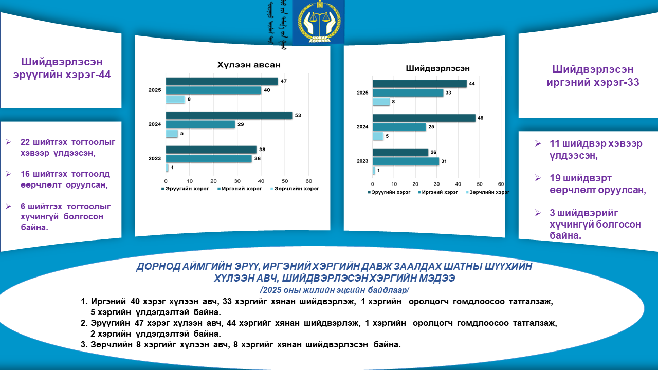 ДОРНОД АЙМГИЙН ЭРҮҮ, ИРГЭНИЙ ХЭРГИЙН ДАВЖ ЗААЛДАХ ШАТНЫ ШҮҮХИЙН 2025 ОНД ХҮЛЭЭН АВЧ, ШИЙДВЭРЛЭСЭН ХЭРГИЙН МЭДЭЭЛЭЛ