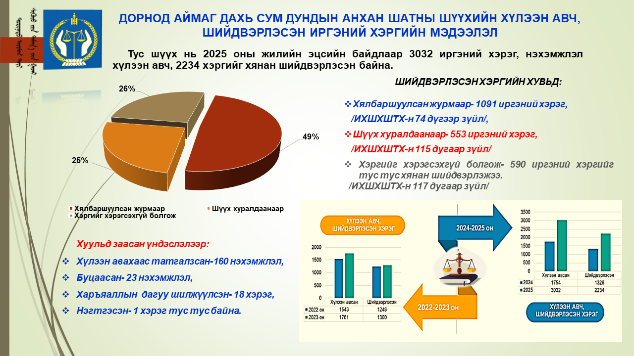 ДОРНОД АЙМГИЙН ЭРҮҮ, ИРГЭНИЙ ХЭРГИЙН ДАВЖ ЗААЛДАХ ШАТНЫ ШҮҮХИЙН 2025 ОНД ХҮЛЭЭН АВЧ, ШИЙДВЭРЛЭСЭН ХЭРГИЙН МЭДЭЭЛЭЛ