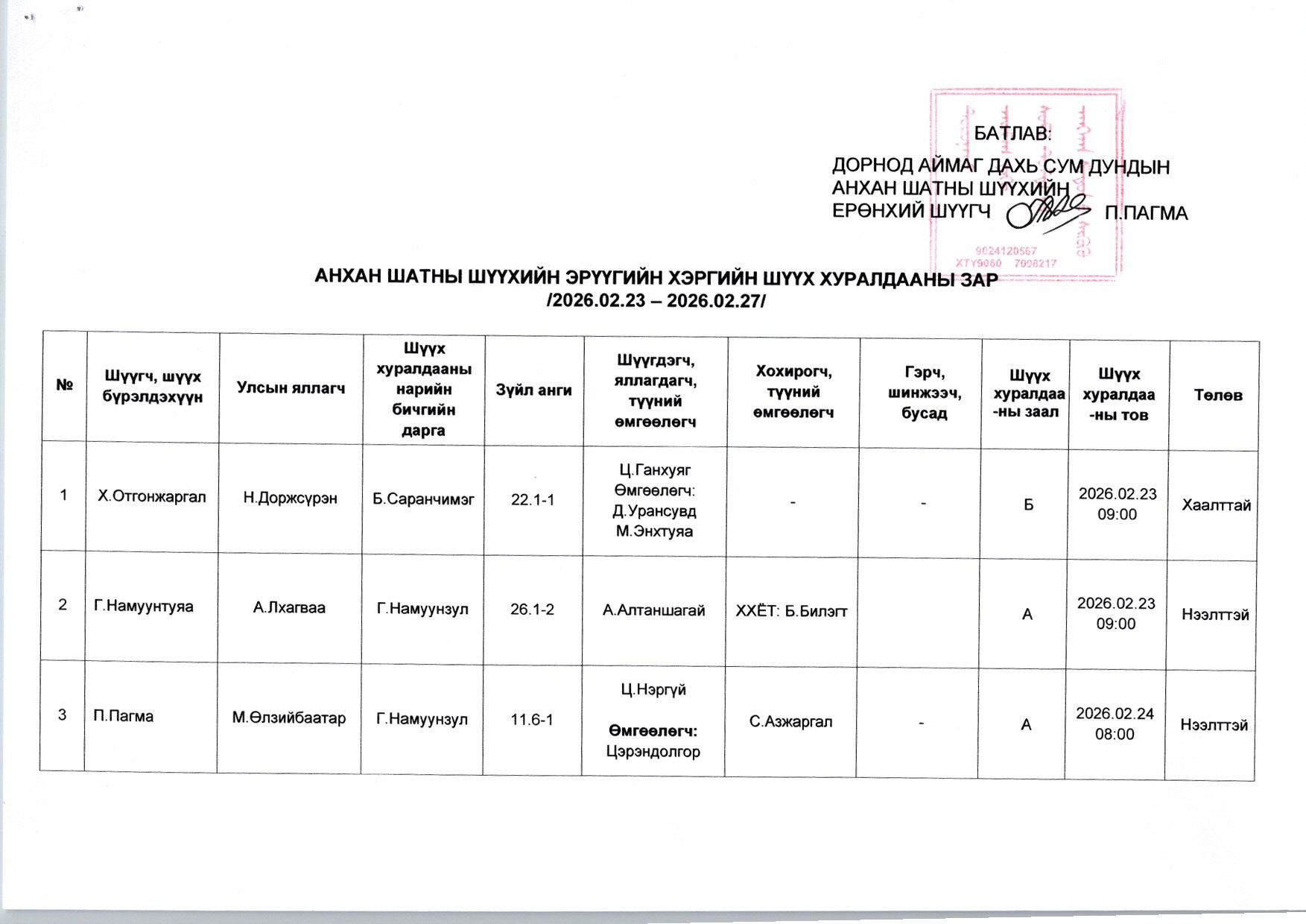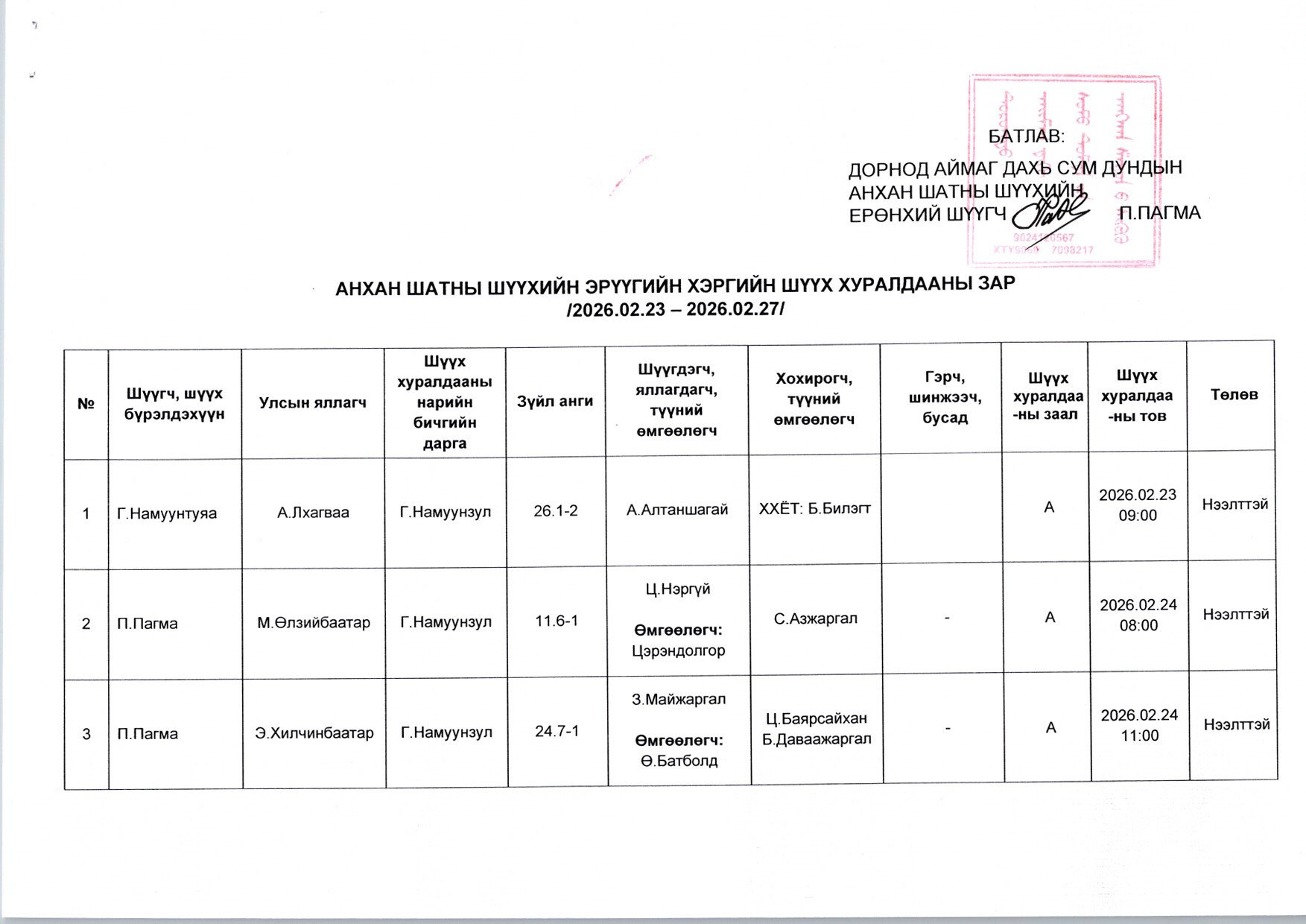 ДОРНОД АЙМАГ ДАХЬ СУМ ДУНДЫН АНХАН ШАТНЫ ШҮҮХИЙН 2026.02.23-НЫ ӨДРӨӨС 2026.02.27-НЫ ӨДРИЙН ХУГАЦААНД ХИЙГДЭХ ЭРҮҮГИЙН ХЭРГИЙН ШҮҮХ ХУРАЛДААНЫ ЗАР