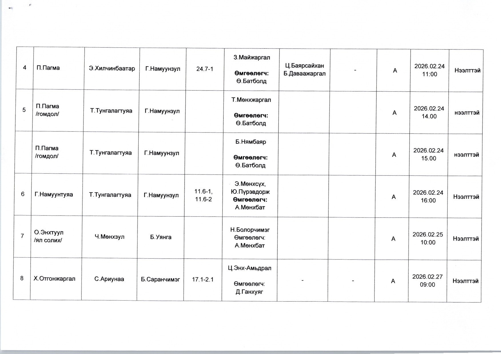 ДОРНОД АЙМГИЙН ЭРҮҮ, ИРГЭНИЙ ХЭРГИЙН ДАВЖ ЗААЛДАХ ШАТНЫ ШҮҮХИЙН 2026.02.26-НЫ ӨДӨР ХИЙГДЭХ ШҮҮХ ХУРАЛДААНЫ ЗАР