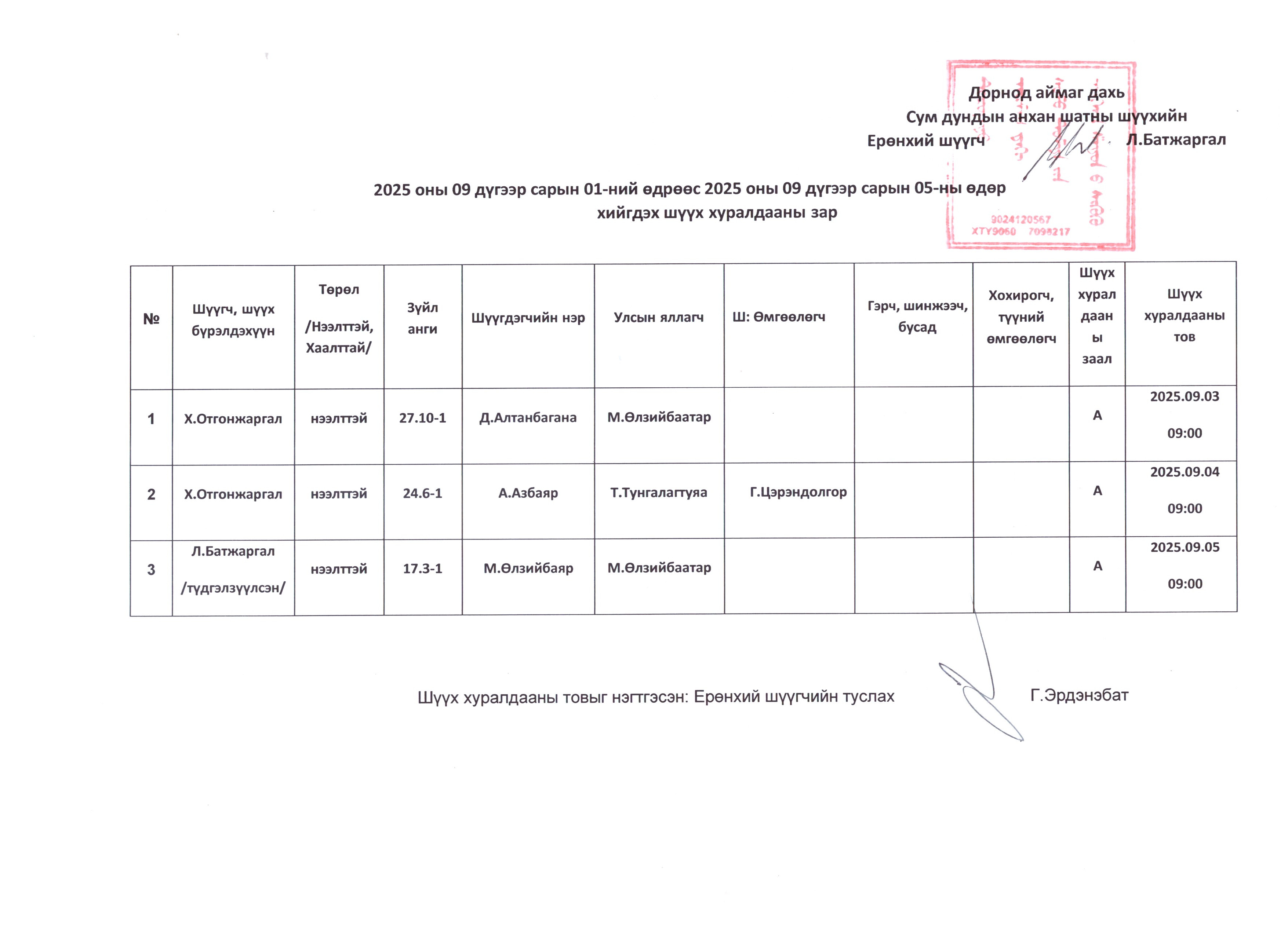 ДОРНОД АЙМАГ ДАХЬ ЗАХИРГААНЫ ХЭРГИЙН АНХАН ШАТНЫ ШҮҮХИЙН 2025 ОНЫ 09 ДҮГЭЭР САРЫН 18-НЫ ӨДӨР ХИЙГДЭХ ШҮҮХ ХУРАЛДААНЫ ЗАР