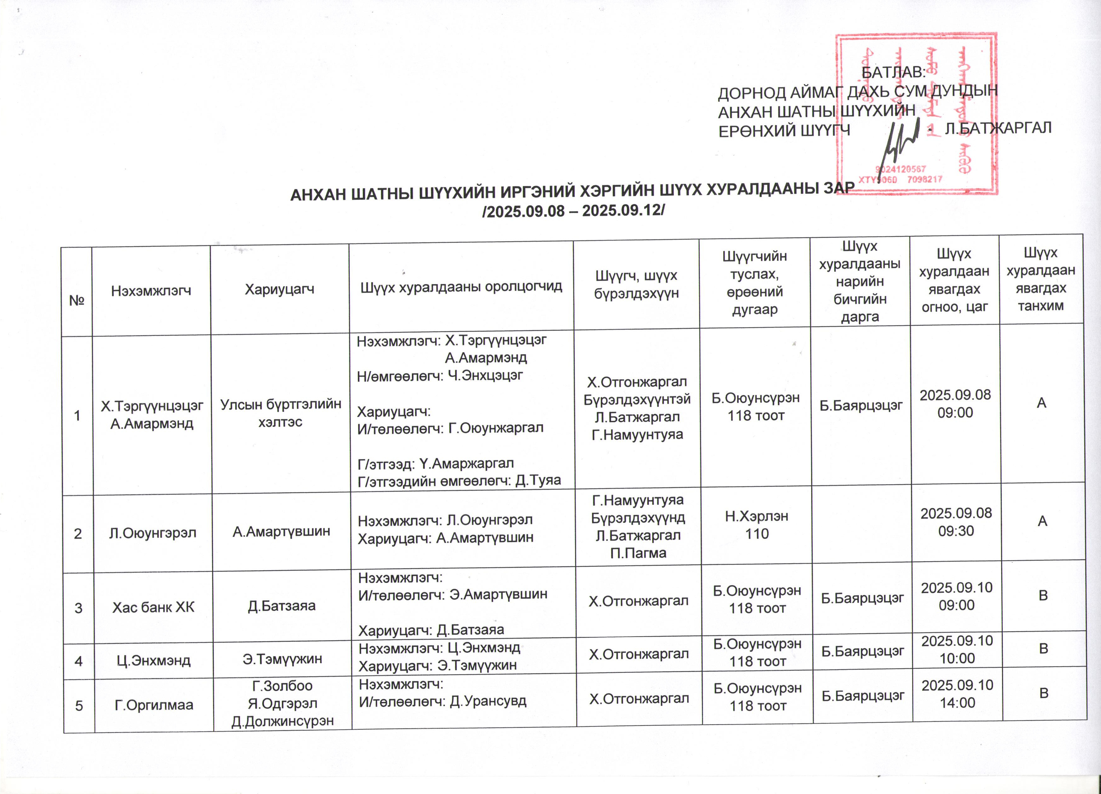 ДОРНОД АЙМАГ ДАХЬ СУМ ДУНДЫН АНХАН ШАТНЫ ШҮҮХИЙН 2025.09.15-НЫ ӨДРӨӨС 2025.09.19-НИЙ ӨДРИЙН ХУГАЦААНД ХИЙГДЭХ ИРГЭНИЙ ШҮҮХ ХУРАЛДААНЫ ЗАР