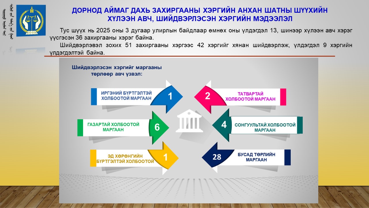ДОРНОД АЙМГИЙН АНХАН БОЛОН ДАВЖ ЗААЛДАХ ШАТНЫ ШҮҮХИЙН 3 ДУГААР УЛИРЛЫН БАЙДЛААР ХҮЛЭЭН АВЧ, ШИЙДВЭРЛЭСЭН ХЭРГИЙН ТОВЧ МЭДЭЭЛЭЛ