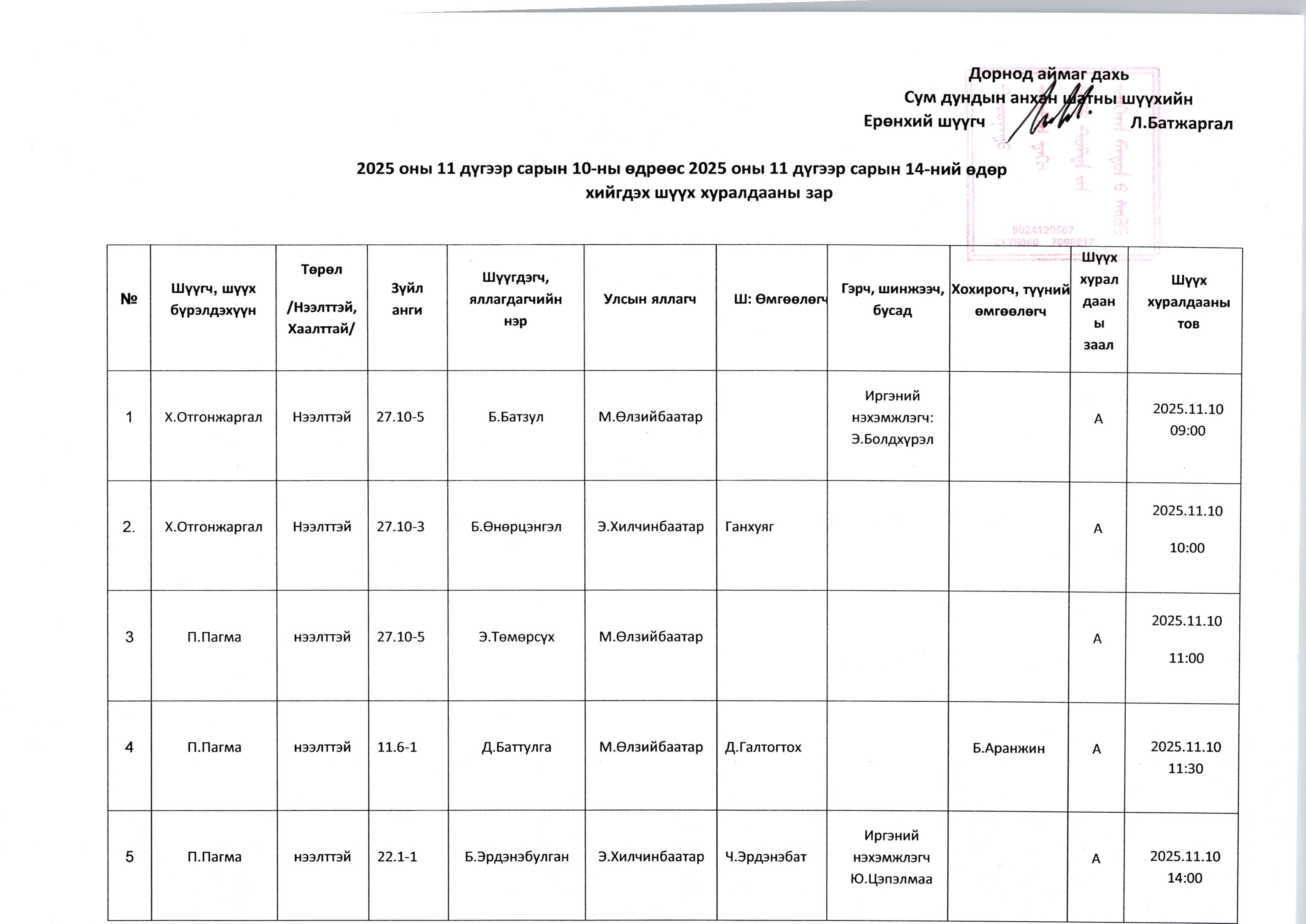 ДОРНОД АЙМАГ ДАХЬ СУМ ДУНДЫН АНХАН ШАТНЫ ШҮҮХИЙН 2025.11.10-НЫ ӨДРӨӨС 2025.11.14-НЫ ӨДРИЙН ХУГАЦААНД ХИЙГДЭХ ЭРҮҮГИЙН ХЭРГИЙН ШҮҮХ ХУРАЛДААНЫ ЗАР