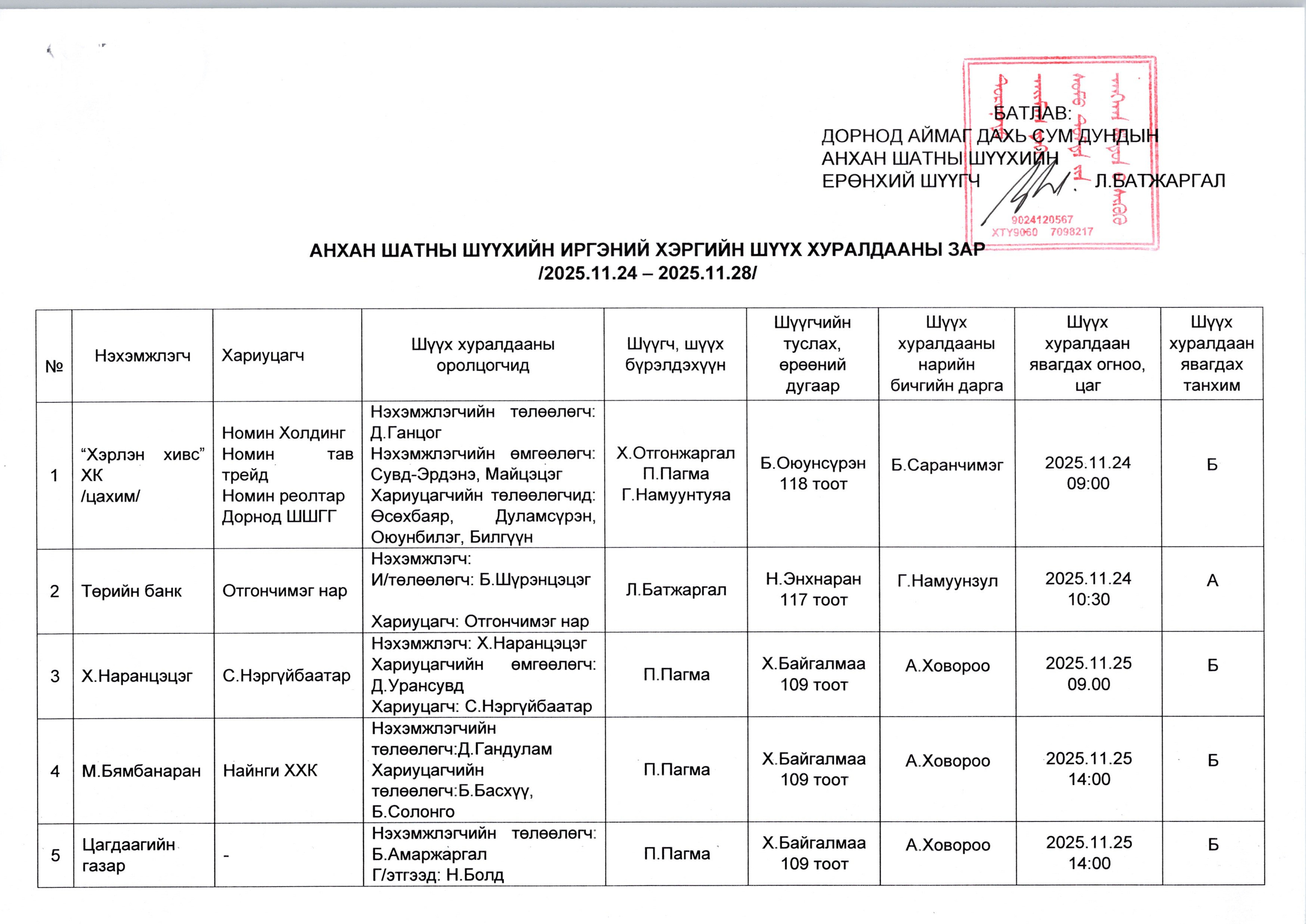ДОРНОД АЙМАГ ДАХЬ СУМ ДУНДЫН АНХАН ШАТНЫ ШҮҮХИЙН 2025.11.24-НИЙ ӨДРӨӨС 2025.11.28-НЫ ӨДРИЙН ХУГАЦААНД ХИЙГДЭХ ЭРҮҮГИЙН ХЭРГИЙН ШҮҮХ ХУРАЛДААНЫ ЗАР