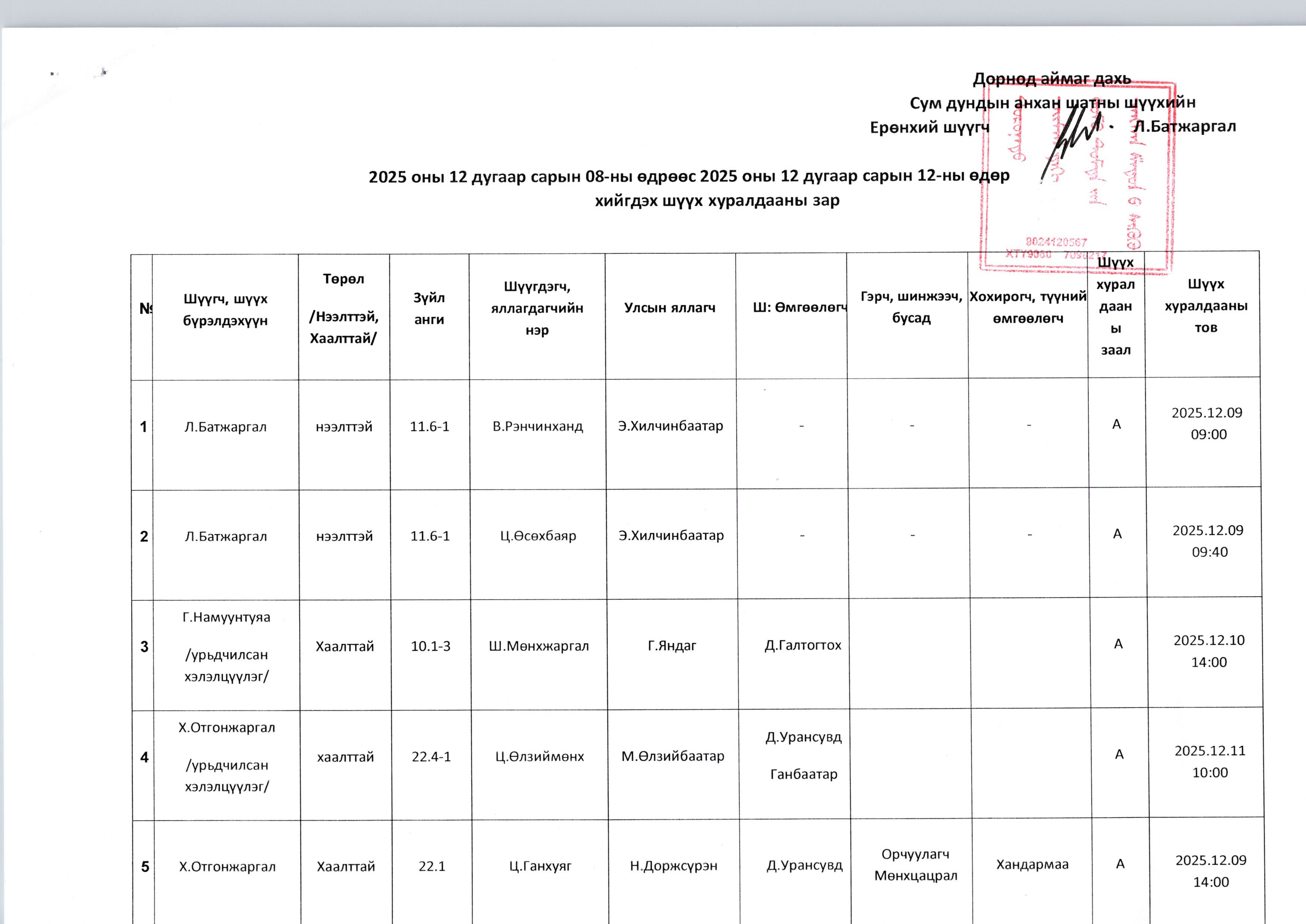 ДОРНОД АЙМГИЙН ЭРҮҮ, ИРГЭНИЙ ХЭРГИЙН ДАВЖ ЗААЛДАХ ШАТНЫ ШҮҮХИЙН 2025 ОНД ХҮЛЭЭН АВЧ, ШИЙДВЭРЛЭСЭН ХЭРГИЙН МЭДЭЭЛЭЛ