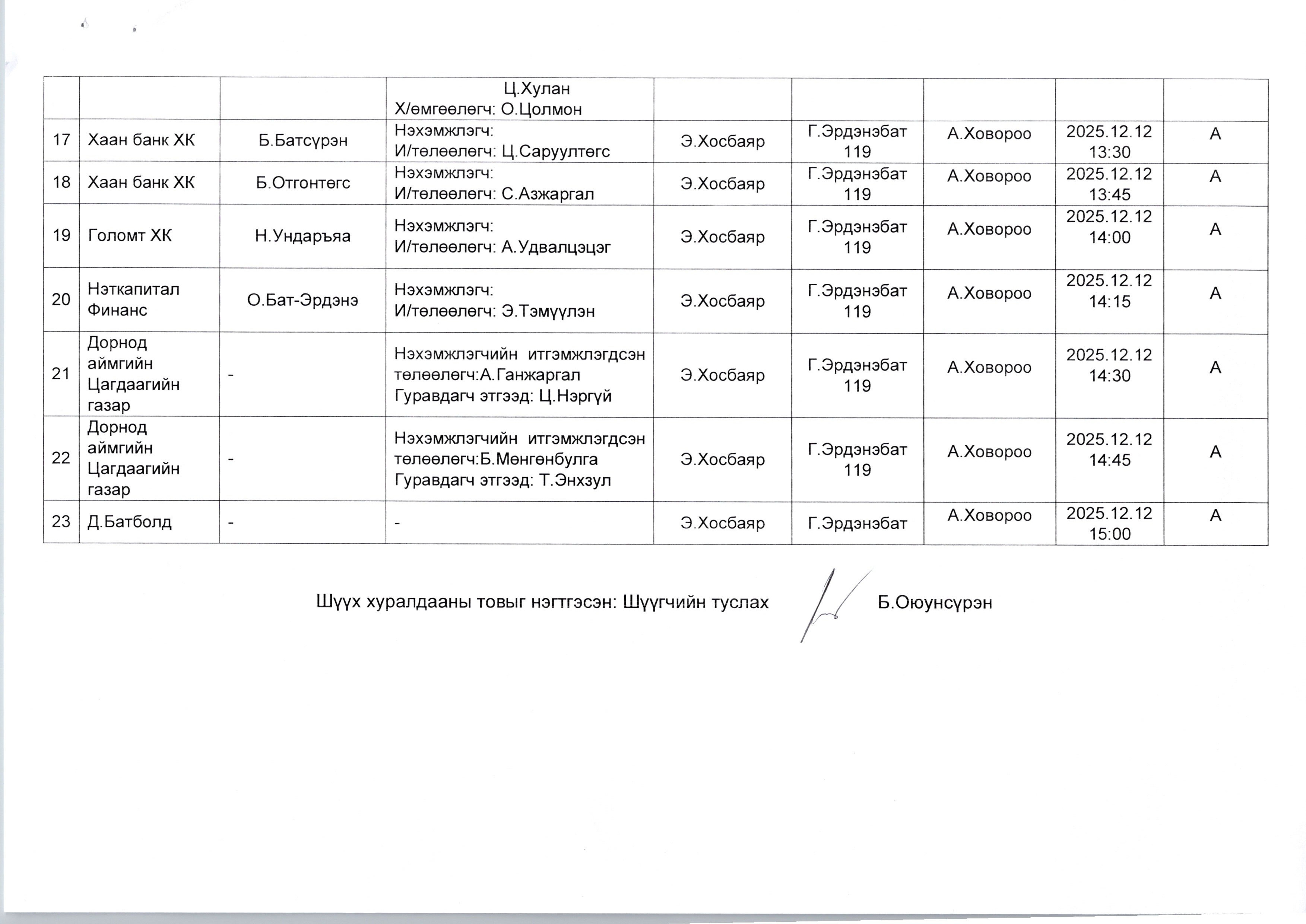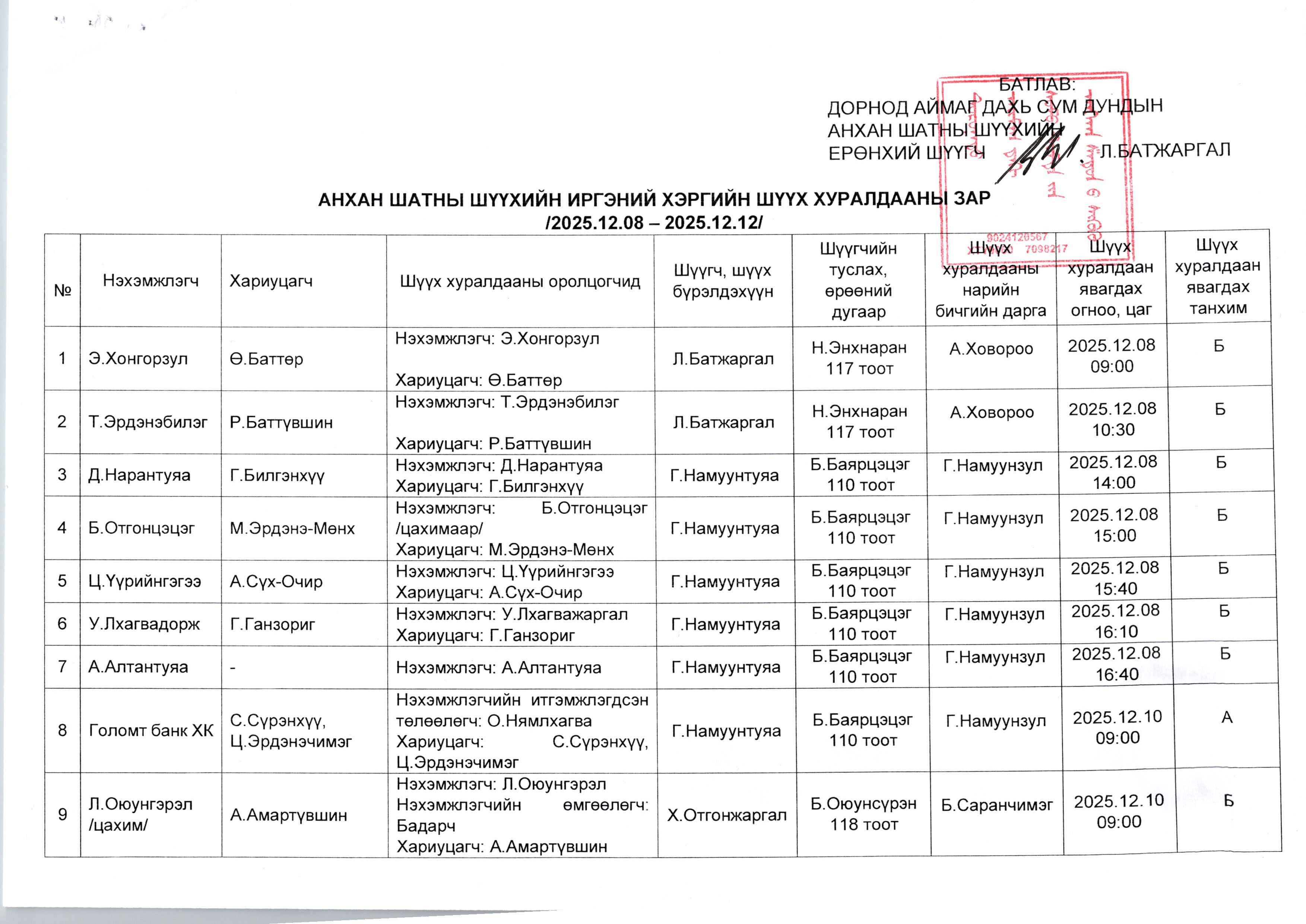 ДОРНОД АЙМАГ ДАХЬ СУМ ДУНДЫН АНХАН ШАТНЫ ШҮҮХИЙН 2025.12.08-НЫ ӨДРӨӨС 2025.12.12-НЫ ӨДРИЙН ХУГАЦААНД ХИЙГДЭХ ЭРҮҮГИЙН ХЭРГИЙН ШҮҮХ ХУРАЛДААНЫ ЗАР