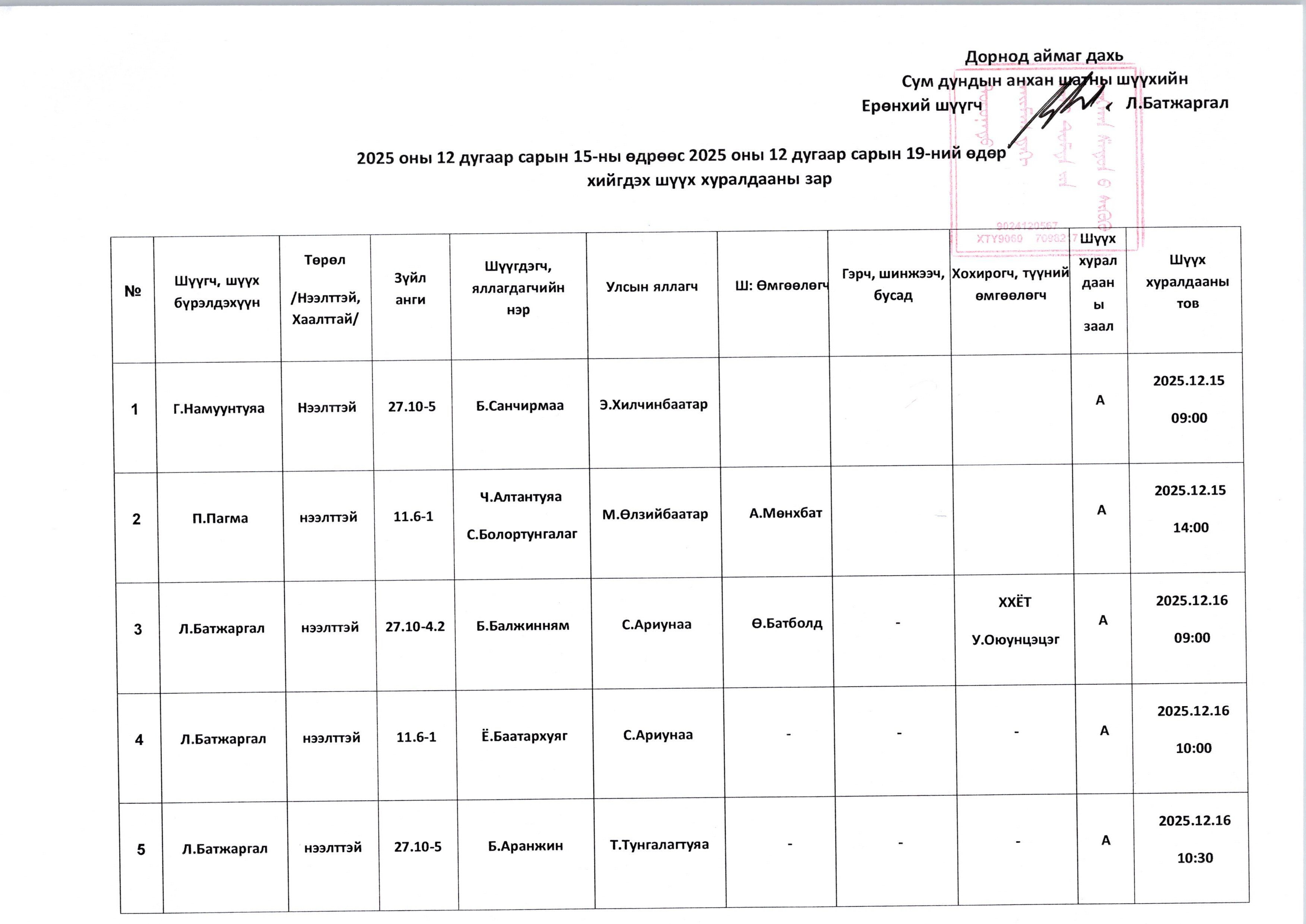 ДОРНОД АЙМАГ ДАХЬ СУМ ДУНДЫН АНХАН ШАТНЫ ШҮҮХИЙН 2025.12.15-НЫ ӨДРӨӨС 2025.12.19-НИЙ ӨДРИЙН ХУГАЦААНД ХИЙГДЭХ ЭРҮҮГИЙН ХЭРГИЙН ШҮҮХ ХУРАЛДААНЫ ЗАР