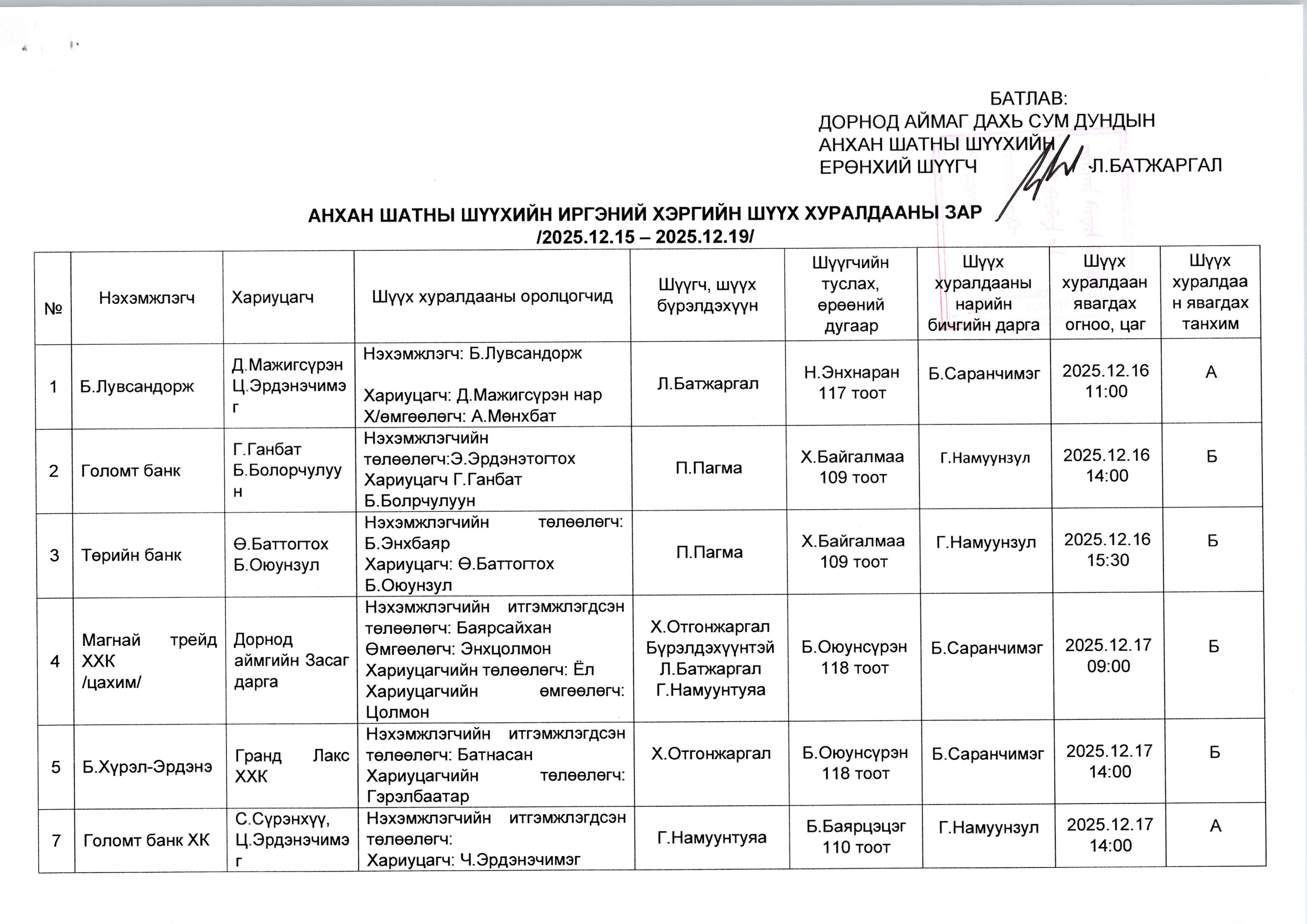ДОРНОД АЙМАГ ДАХЬ СУМ ДУНДЫН АНХАН ШАТНЫ ШҮҮХИЙН 2025.12.15-НЫ ӨДРӨӨС 2025.12.19-НИЙ ӨДРИЙН ХУГАЦААНД ХИЙГДЭХ ЭРҮҮГИЙН ХЭРГИЙН ШҮҮХ ХУРАЛДААНЫ ЗАР