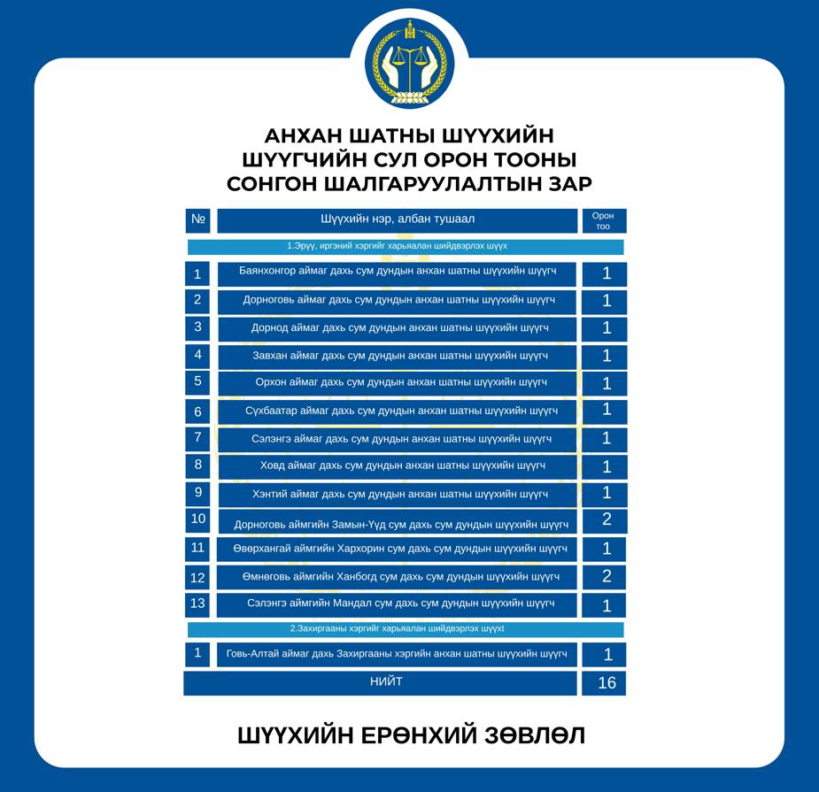 ДОРНОД АЙМАГ ДАХЬ ЗАХИРГААНЫ ХЭРГИЙН АНХАН ШАТНЫ ШҮҮХИЙН 2026.01.29-НИЙ ӨДӨР ХИЙГДЭХ ШҮҮХ ХУРАЛДААНЫ ЗАР