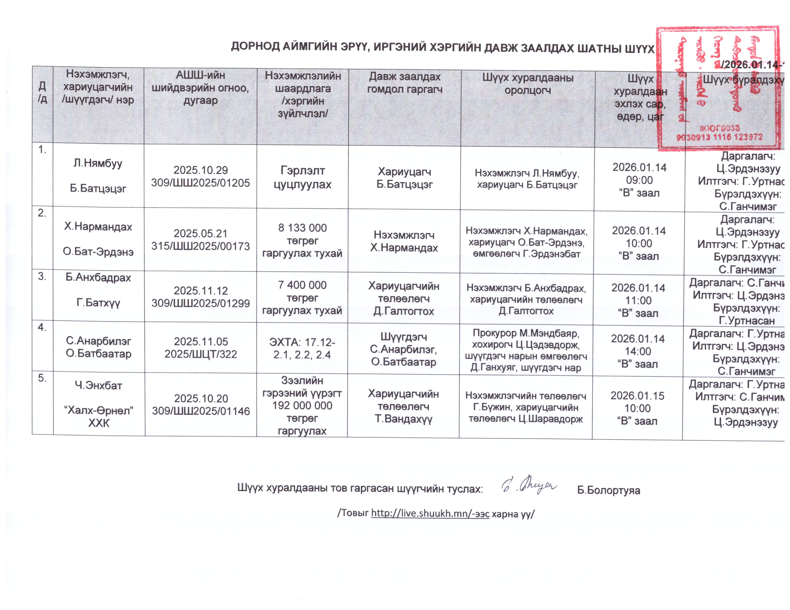 ДОРНОД АЙМГИЙН ЭРҮҮ, ИРГЭНИЙ ХЭРГИЙН ДАВЖ ЗААЛДАХ ШАТНЫ ШҮҮХИЙН 2026.01.14-НИЙ ӨДРӨӨС 2026.01.15-НЫ ӨДРИЙН ХУГАЦААНД ХИЙГДЭХ ШҮҮХ ХУРАЛДААНЫ ЗАР