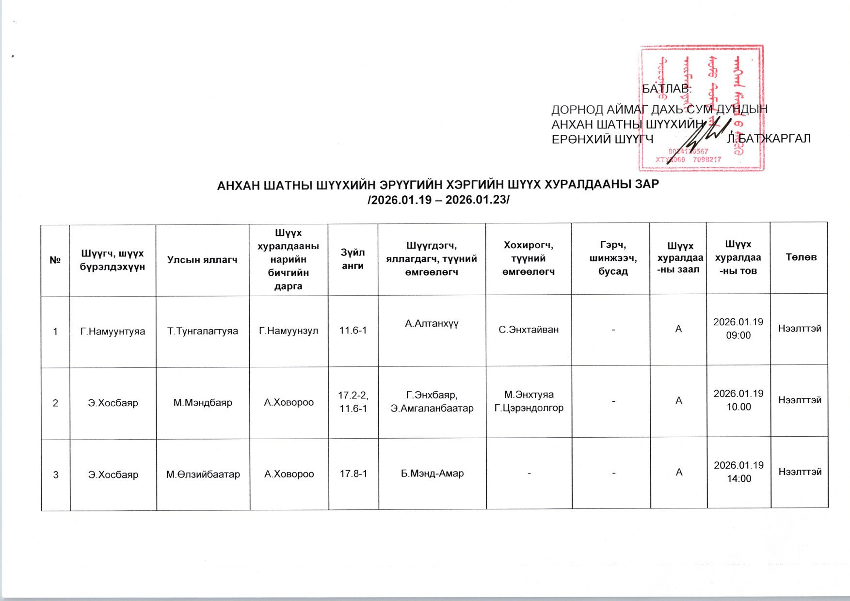 ДОРНОД АЙМАГ ДАХЬ ЗАХИРГААНЫ ХЭРГИЙН АНХАН ШАТНЫ ШҮҮХИЙН 2026.01.20-НЫ ӨДРӨӨС 2026.01.22-НЫ ӨДРИЙН ХУГАЦААНД ХИЙГДЭХ ШҮҮХ ХУРАЛДААНЫ ЗАР