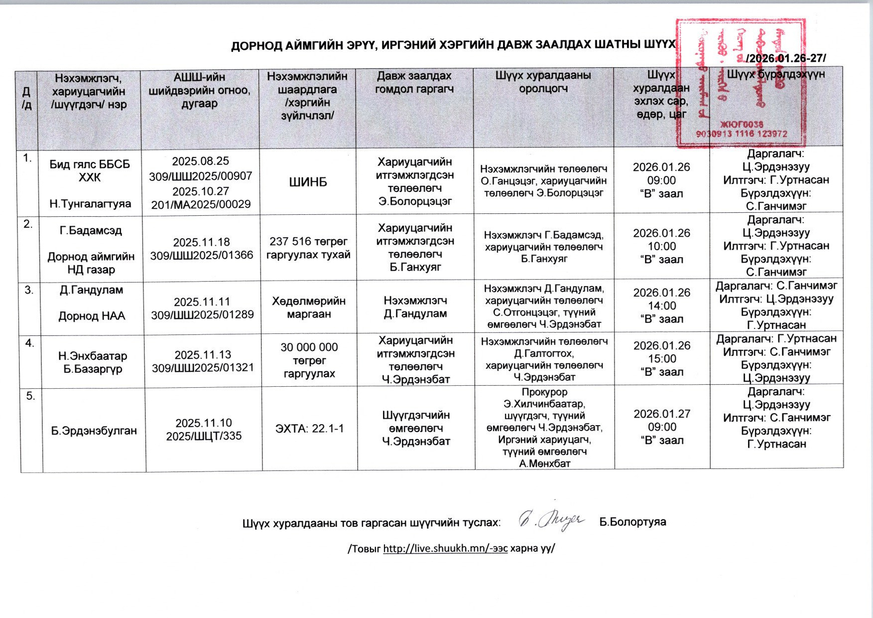 ДОРНОД АЙМГИЙН ЭРҮҮ, ИРГЭНИЙ ХЭРГИЙН ДАВЖ ЗААЛДАХ ШАТНЫ ШҮҮХИЙН 2026.01.26-НЫ ӨДРӨӨС 2026.01.27-НЫ ӨДРИЙН ХУГАЦААНД ХИЙГДЭХ ШҮҮХ ХУРАЛДААНЫ ЗАР