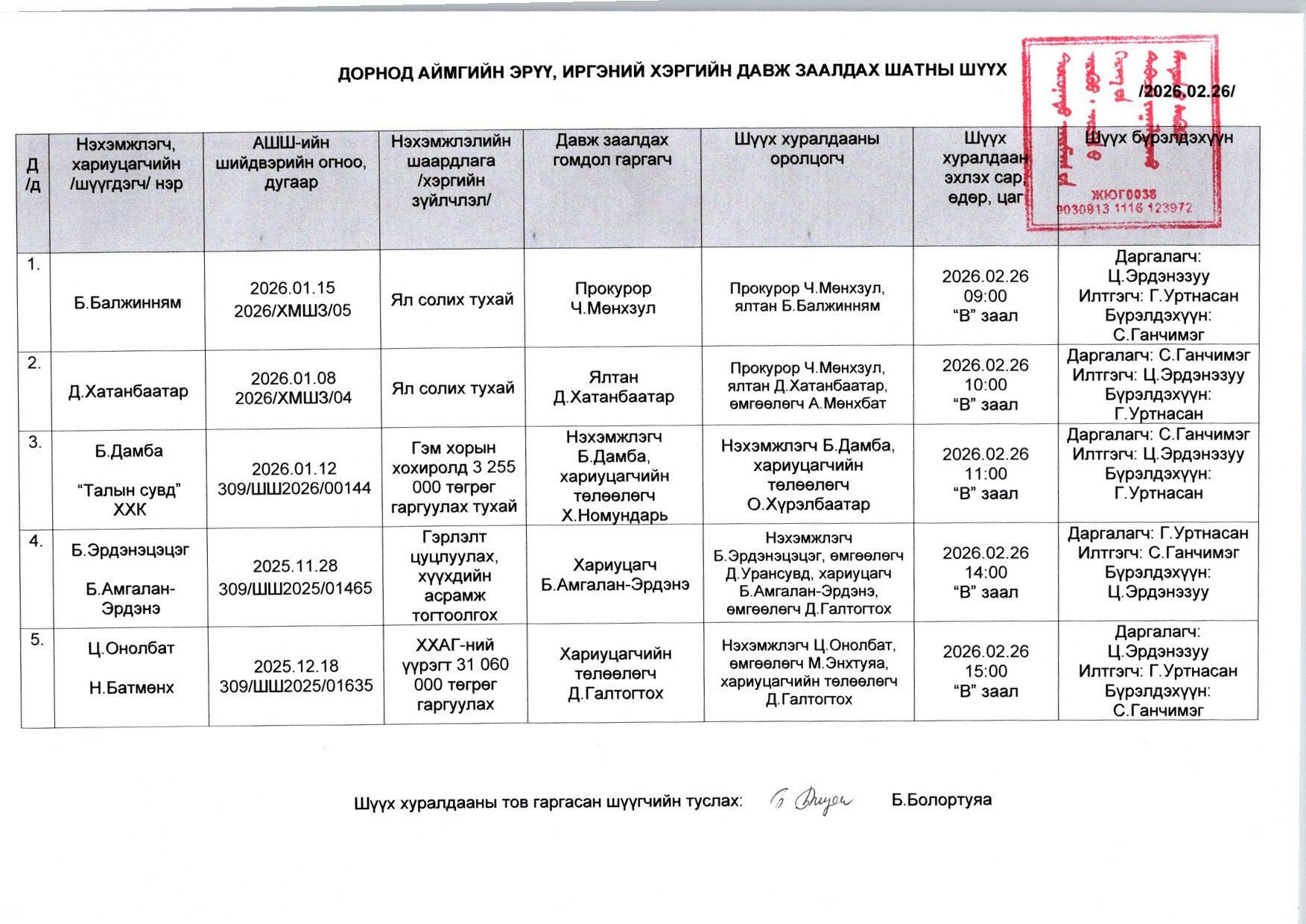 ДОРНОД АЙМГИЙН ЭРҮҮ, ИРГЭНИЙ ХЭРГИЙН ДАВЖ ЗААЛДАХ ШАТНЫ ШҮҮХИЙН 2026.02.26-НЫ ӨДӨР ХИЙГДЭХ ШҮҮХ ХУРАЛДААНЫ ЗАР