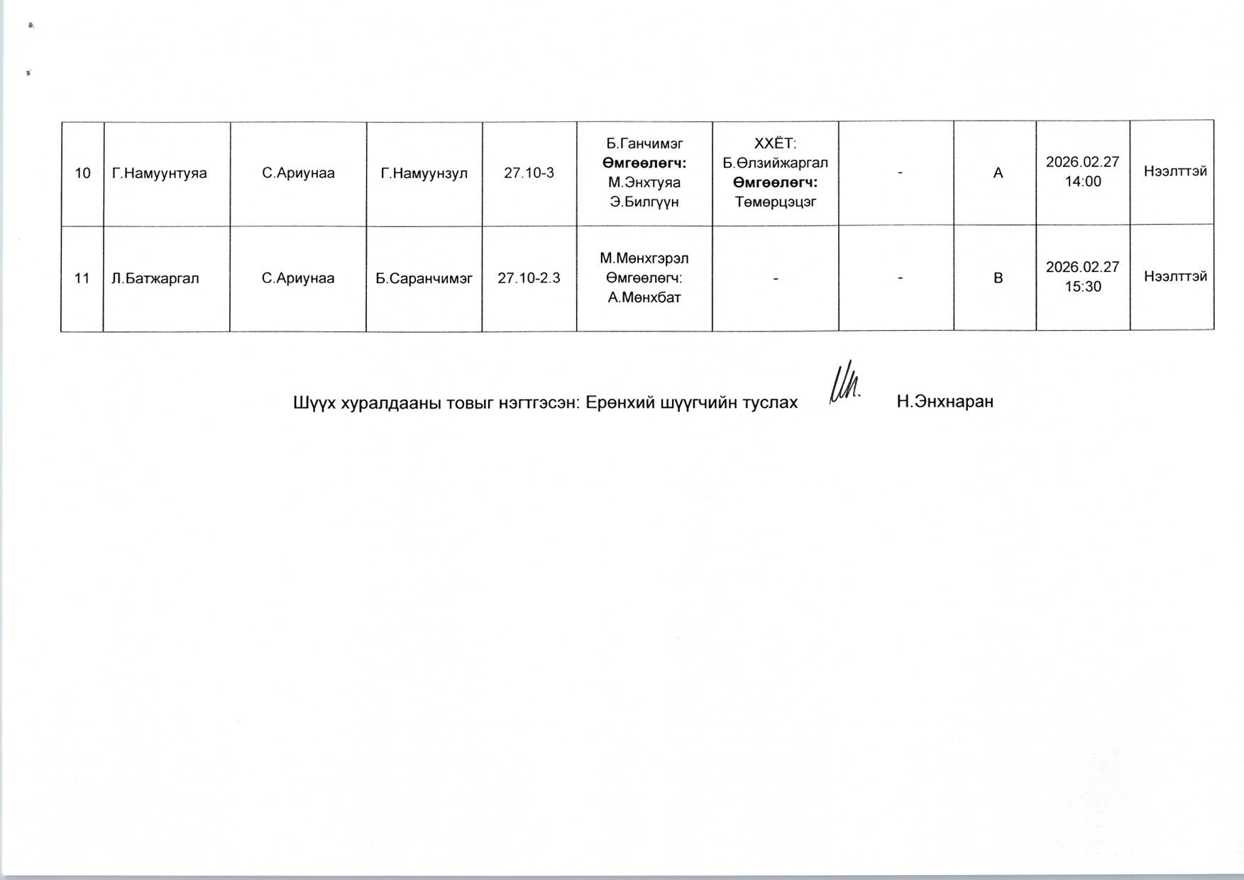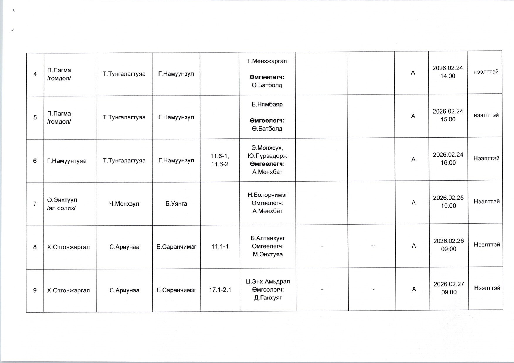 ДОРНОД АЙМГИЙН ЭРҮҮ, ИРГЭНИЙ ХЭРГИЙН ДАВЖ ЗААЛДАХ ШАТНЫ ШҮҮХИЙН 2026.02.26-НЫ ӨДӨР ХИЙГДЭХ ШҮҮХ ХУРАЛДААНЫ ЗАР